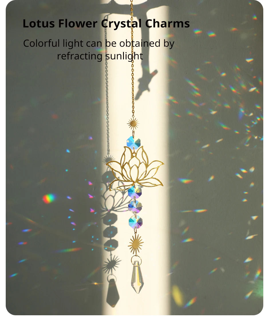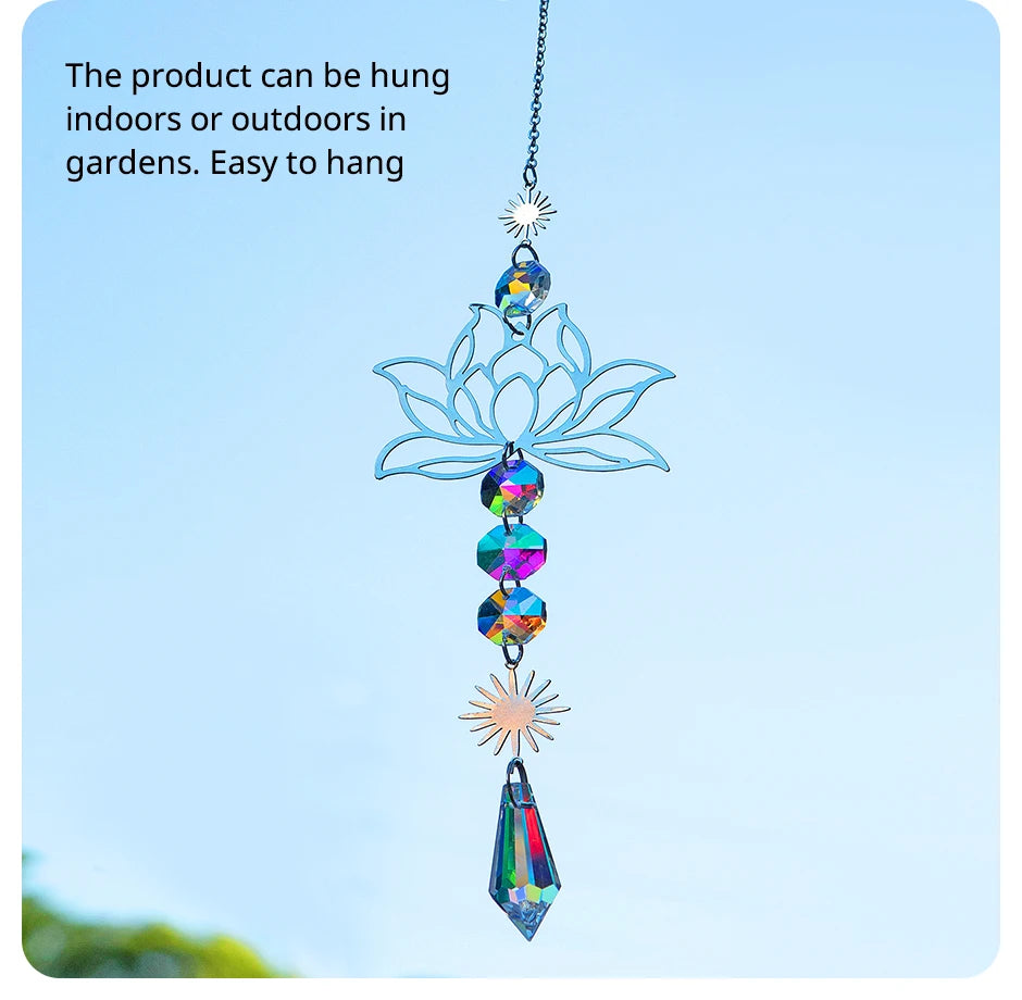 Dieser Lotus-Sonnenfänger- vereint schlichte Eleganz mit positiver Energie. Das filigrane Lotus-Design und die funkelnden Kristall-Elemente brechen das Sonnenlicht in zarte Farbspiele – ein zauberhafter Blickfang für Fenster, Balkon oder Garten. Ideal, um Licht, Leichtigkeit und Harmonie in dein Zuhause zu bringen. ✨