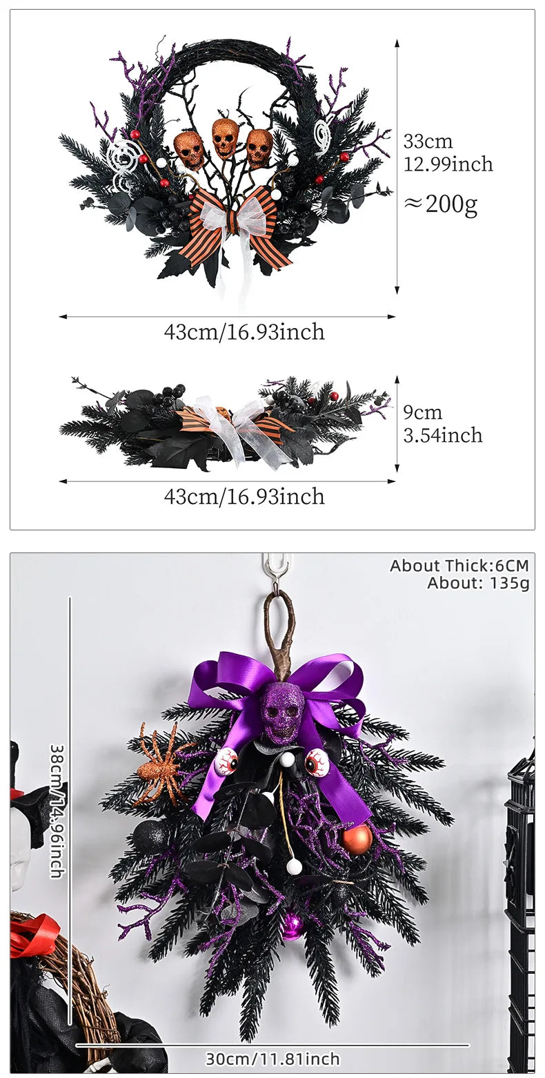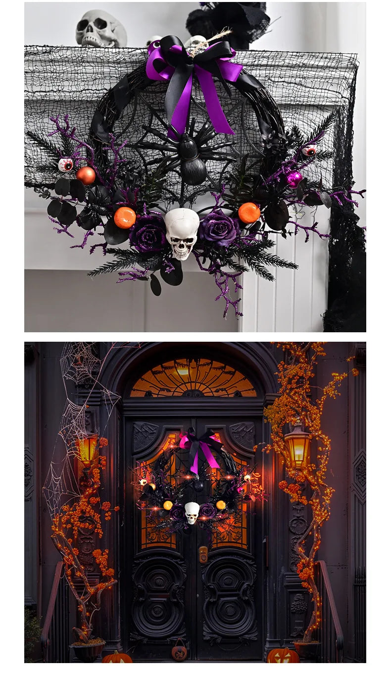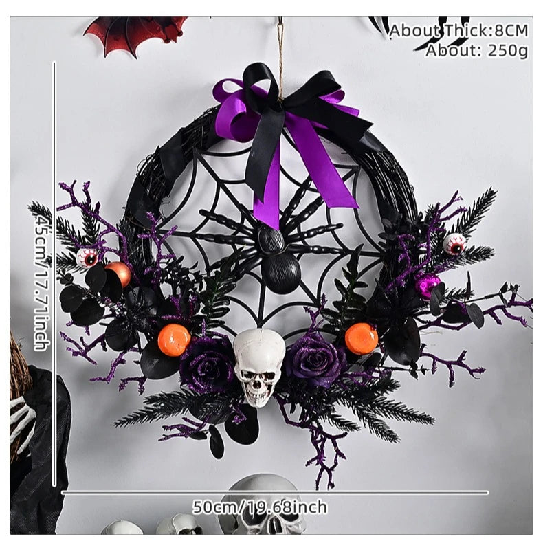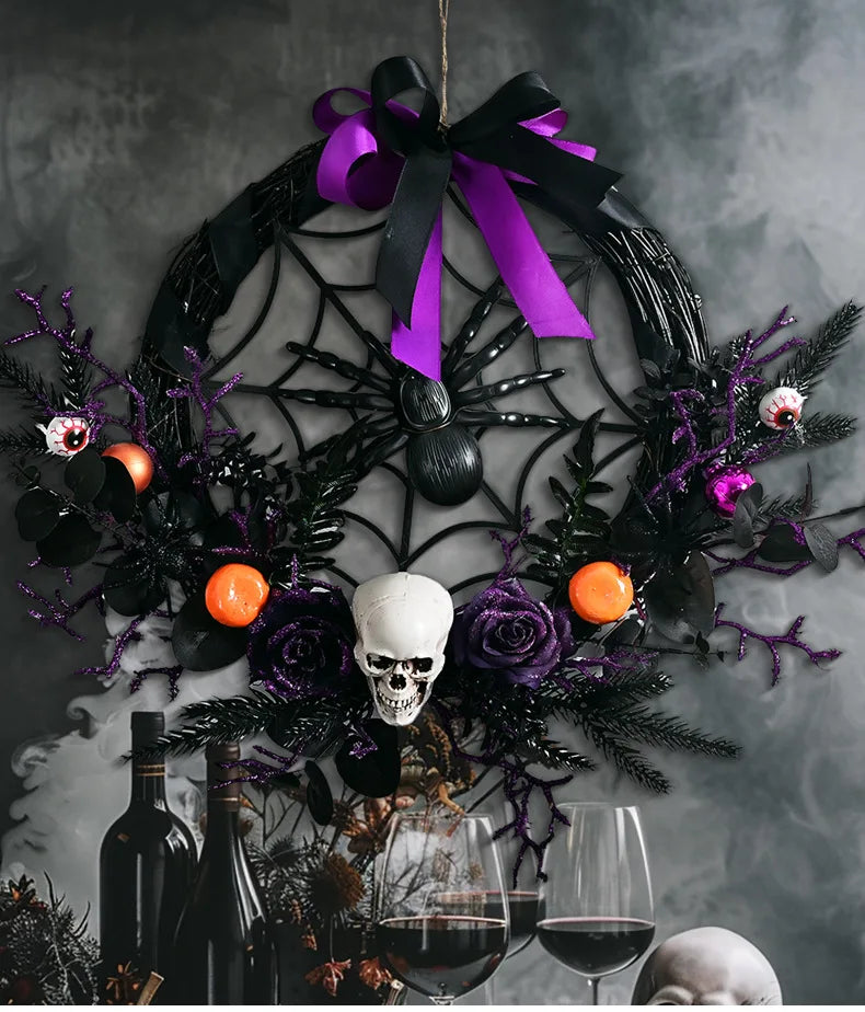 Dieser eindrucksvolle Kranz- mit Schädel-Details und lila Ranken bringt sofort gruselige Stimmung an deine Tür. Die Kombination aus dunklen Farben und markanten Elementen sorgt für ein mystisches Ambiente, das perfekt zu deiner Halloween-Party oder als Deko fürs Zuhause passt. Ob im Eingangsbereich oder im Wohnzimmer – dieser Kranz zieht alle Blicke auf sich. 🎃
