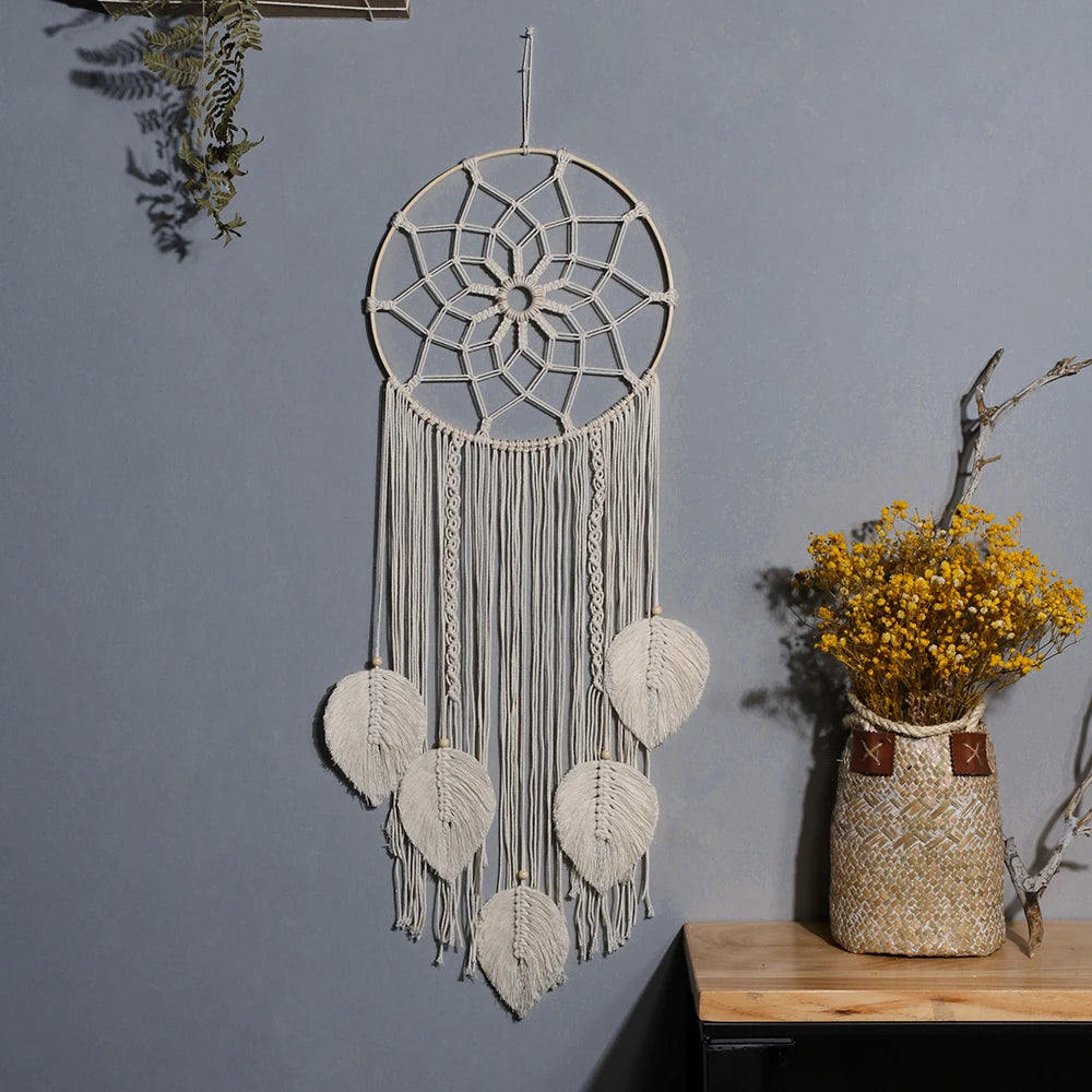 Ein Hauch von Boho-Magie- trifft auf nordisches Design. Dieser Makramee-Traumfänger mit zarten Blattakzenten bringt natürliche Leichtigkeit in dein Zuhause. Gefertigt aus hochwertigem Baumwollgarn in kunstvoller Handarbeit, verleiht er jedem Raum eine ruhige, ästhetische Ausstrahlung – perfekt für dein persönliches Wohlfühlambiente. 🌿